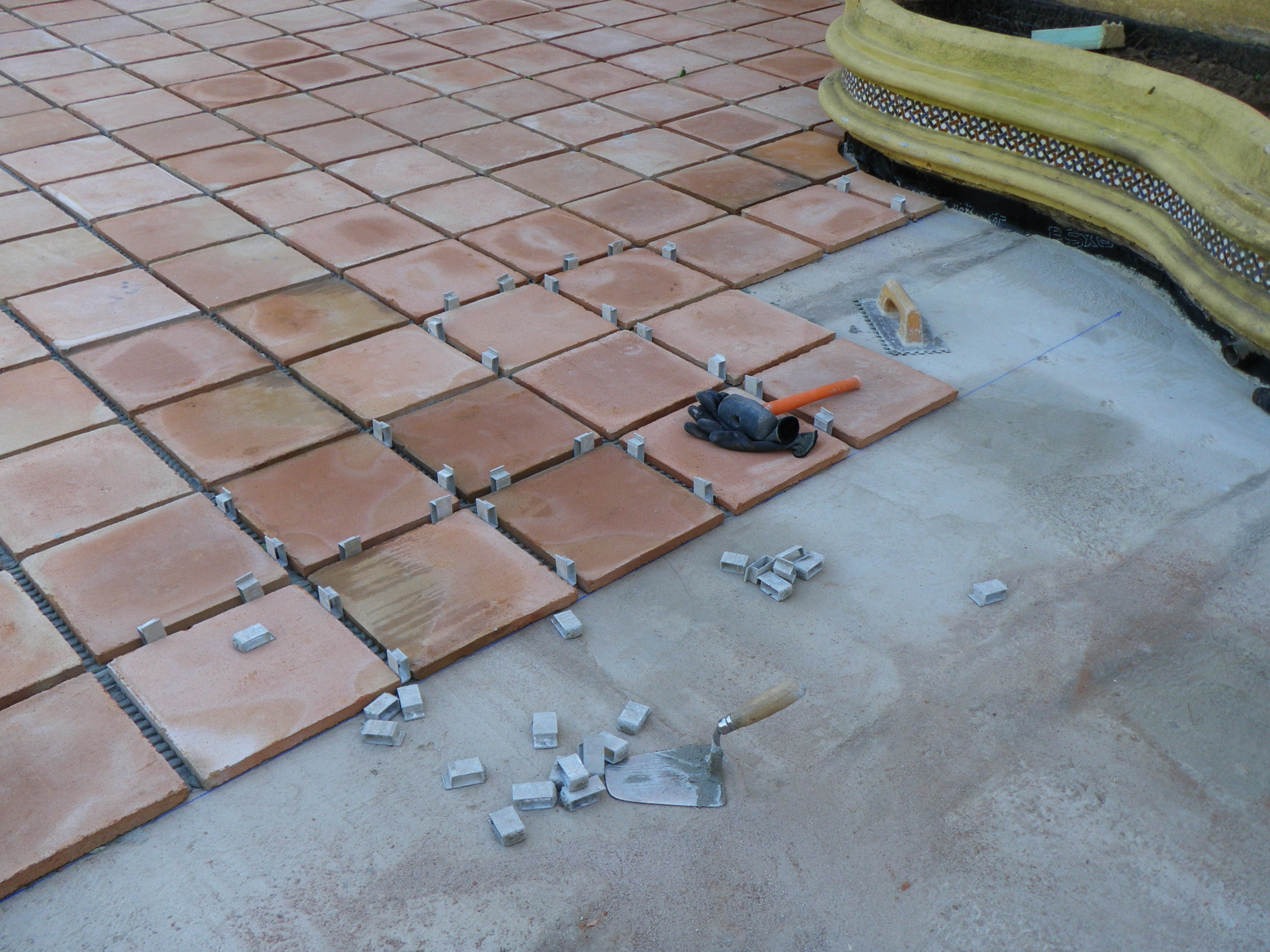 | If the area to be laid on is irregular, it has to be levelled. For this a layer of more than 5 mm. of mortar must be used, terracotta tiles are then fixed directly, and this is known as “THICK COATING”. The inconvenience of laying by this method is that you must wait for both the mortar and the terracotta to be completely dry before sealant treatment can be started. | ![]() |
